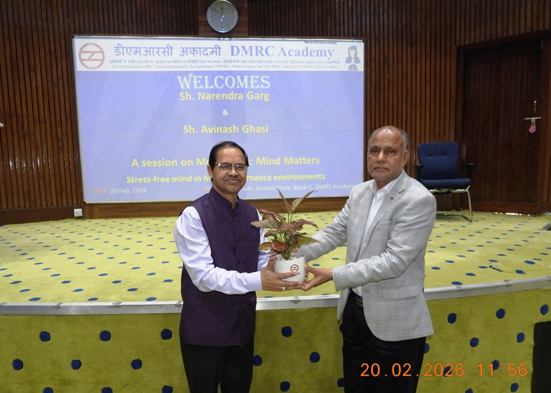On 20 Feb. 2026, DMRC Academy organized an insightful session titled “Mind Matters: Stress-Free Mind in a High-Performance Environment” in line with the principles of the Indian Knowledge System. The session was conducted by Sh. Avinash Ghasi from APEX – the corporate training arm of ‘The Art of Living’. Sh. Ghasi led a guided meditation, highlighting the profound connection between mind and body and its influence on productivity and overall well-being. He elaborated on the seven states of human existence — Body, Breath, Mind, Intellect, Memory, Ego, and Self — and explained how their harmonious alignment enhances performance in competitive environments. The interactive session offered practical techniques for stress management, focus, and inner balance, concluding on an uplifting and energizing note for all participants.